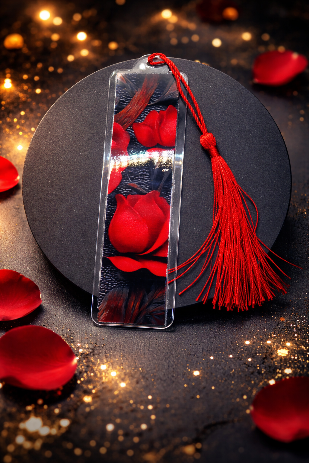 Marque-page en acrylique rose rouge et son pompon assorti